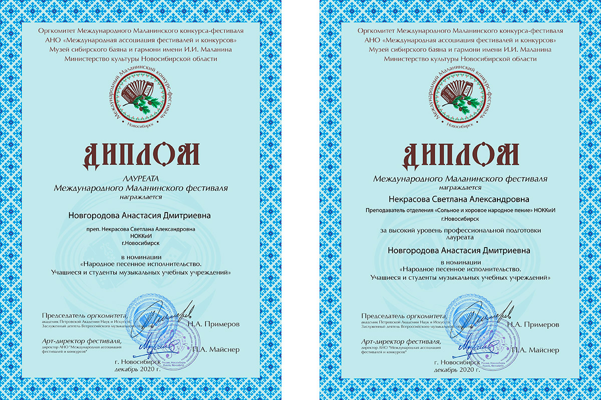 Поздравляем студентку группы 43-н Новгородову Анастасию с получением звания Лауреата Международного Маланинского фестиваля в номинации "Народное песенное исполнительство. Учащиеся и студенты музыкальных учебных учреждений" и преподавателя Некрасову С.А. отделения "Сольное и хоровое народное пение" ГАПОУ НСО НОККиИ за высокий уровень подготовки Лауреата.