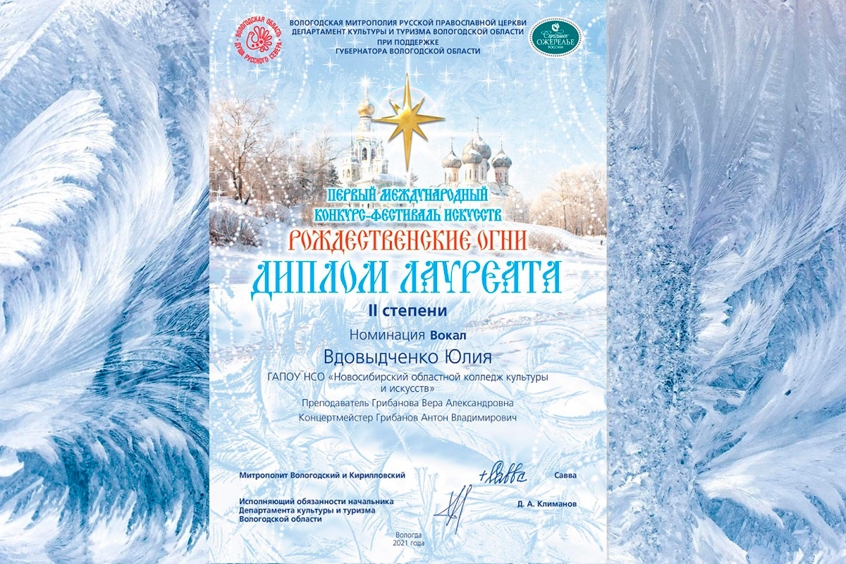 Поздравляем преподавателя отделения "Сольное и хоровое народное пение" Грибанову Веру Александровну, концертмейстера Грибанова Антона Владимировича и студентку группы 43 н Вдовыдченко Юлию со званием Лауреата 2 степени в Первом международном конкурсе-фестивале искусств "Рождественские огни" (г. Вологда).