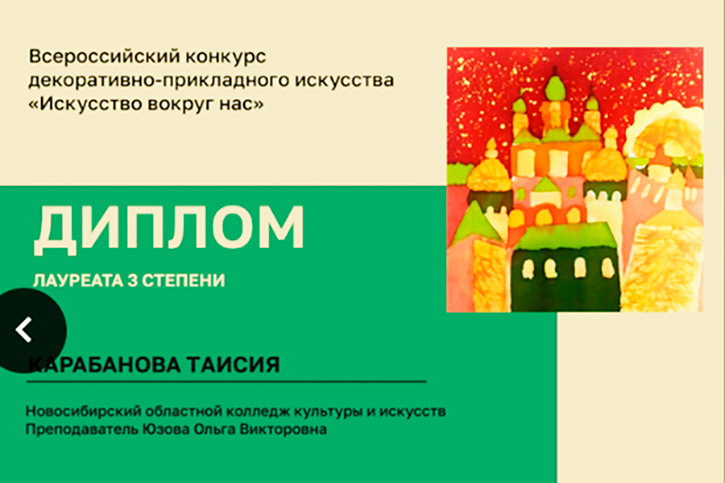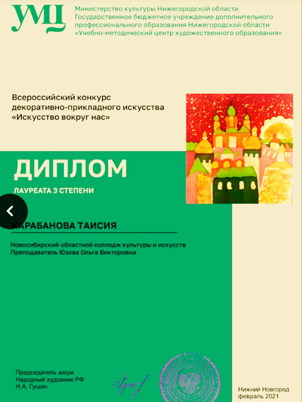 Конкурсная комиссия Всероссийского конкурса декоративно-прикладного искусства высоко оценила работы наших студентов. В Нижнем Новгороде подведены итоги конкурса, который проводился Министерством культуры Нижегородской области. На суд жюри были представлены работы в технике "роспись по дереву". В результате, Таисия Карабанова получила Диплом лауреата III степени, а Мария Васильева - Диплом участника конкурса. Девушки - студентки второго курса нашего колледжа. Преподаватель Ольга Викторовна Юзова.