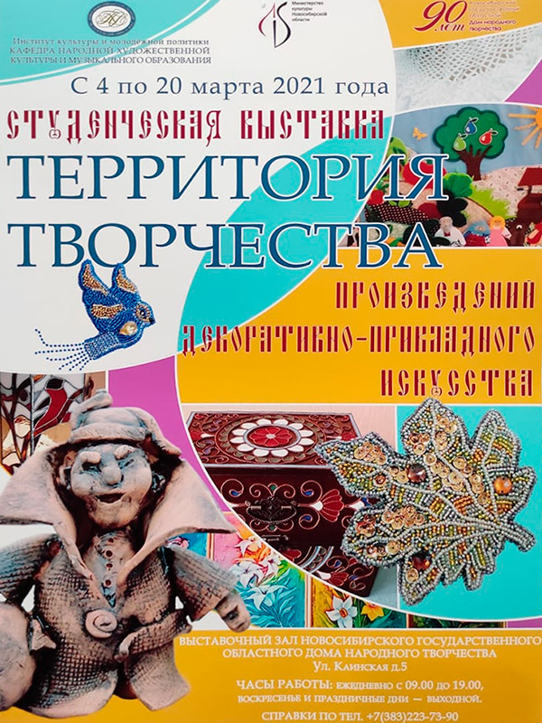 Сегодня в Новосибирской области начала работу студенческая выставка "Территория творчества" произведений декоративно-прикладного искусства в рамках юбилейных мероприятий областного дома народного творчества. Все работы выполнены студентами Новосибирского Педагогического Университета. Выставка будет работать до 20 марта, ну а наши студенты одними из первых, оценили работу мастеров по направлениям лоскутное шитьё, роспись, резьба по дереву, костюмы, текстильные куклы, валяние.