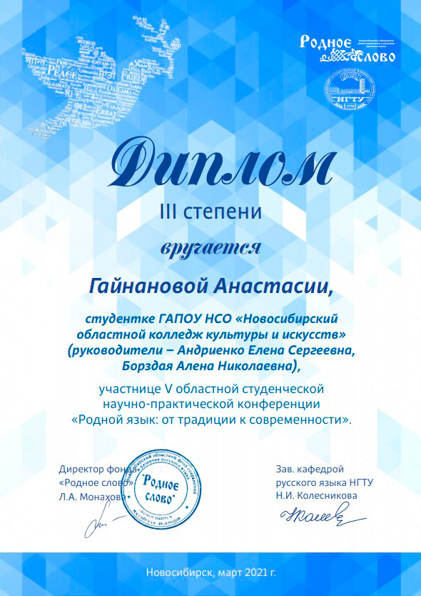 Студентка Гайнанова Анастасия 3 курс режиссерского отделения им. И.Ф.Васильева по итогам конференции получила Диплом III степени. Руководители Елена Сергеевна Андриенко и Алёна Николаевна Борздая.
