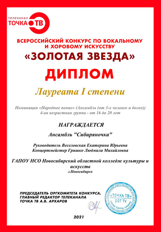 Ансамбль "Сибиряночка" награждён Дипломом Лауреата I степени по итогам Всероссийского конкурса вокального и хорового искусства "Золотая Звезда"!