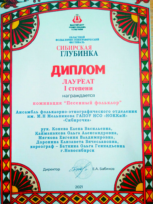 Студенческий ансамбль "Сибирочка" и ансамбль преподавателей "Шиповница" фольклорно-этнографического отделения им. М.Н.Мельникова - стали лауреатами I степени в номинации "Песенный фольклор"!
