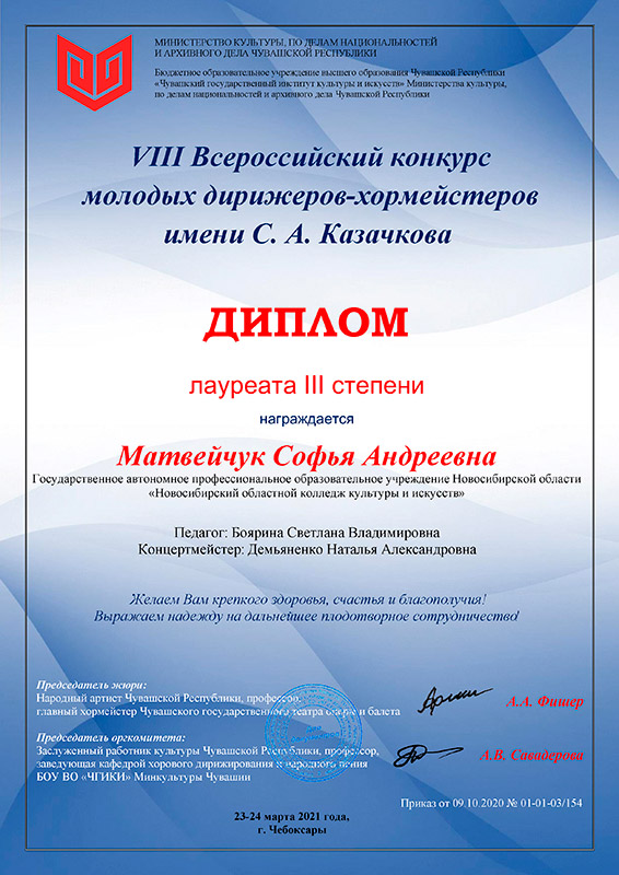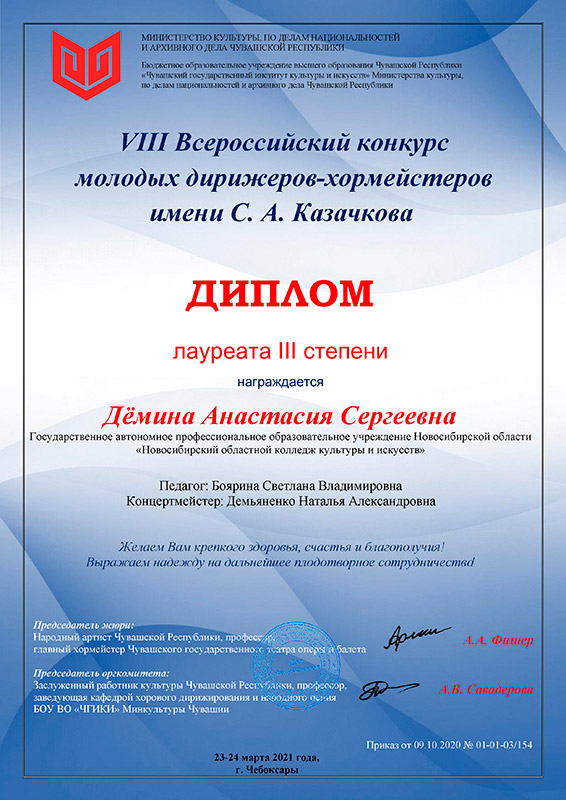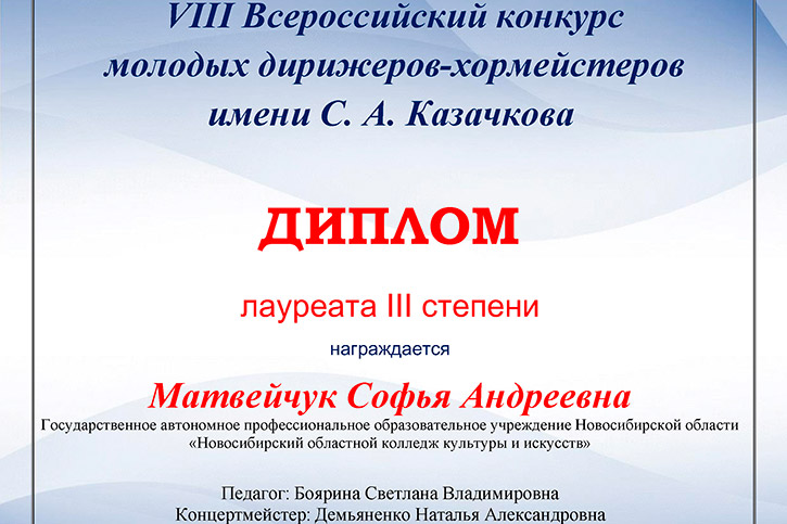 Стали известны результаты VIII Всероссийского конкурса молодых дирижёров-хормейстеров имени С.А.Казачкова, который проходил 23-24 марта в Чувашском государственном институте культуры и искусств (г. Чебоксары) и включал в себя два тура - дирижирование произведений под фортепиано и хормейстерскую работу с учебным хоровым коллективом в течение 10 минут.