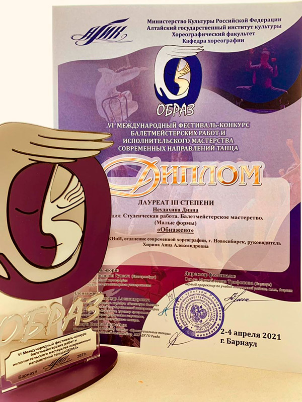 Студентка 2 курса современного направления отделения хореографии им. Г.П.Шадриной - Диана Неудахина стала Лауреатом III степени в номинации малые формы "Обнажено".