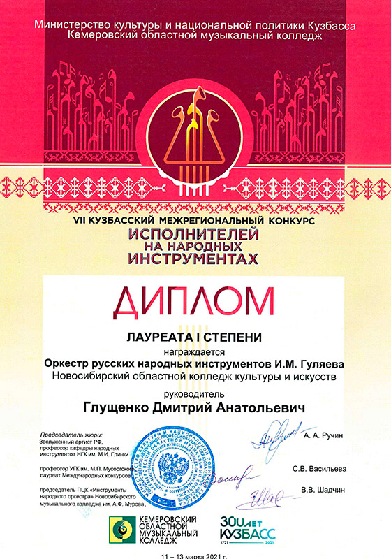 По результатам конкурса оркестр русских народных инструментов им. И.М.Гуляева нашего колледжа стал Лауреатом I степени!