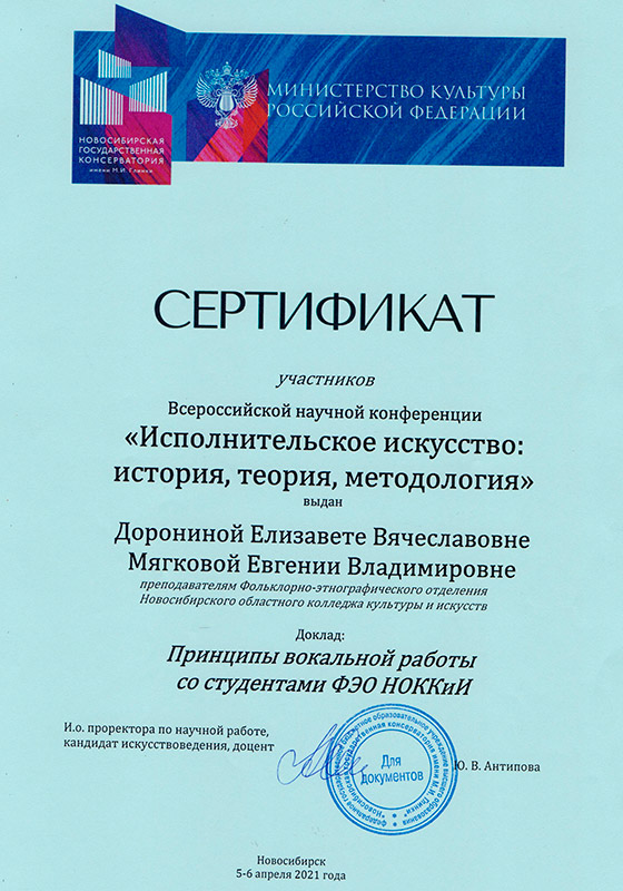 Доронина Елизавета Вячеславовна, Конева Елена Васильевна, Мягкова Евгения Владимировна выступили с докладами: "Проведение Фольклорно-этнографическим отделением им. М.Н.Мельникова НОККиИ музыкальных фольклорных мероприятий для детей и подростков" и "Принципы вокальной работы со студентами ФЭО НОККиИ".