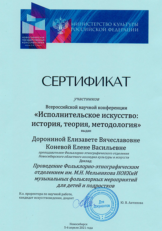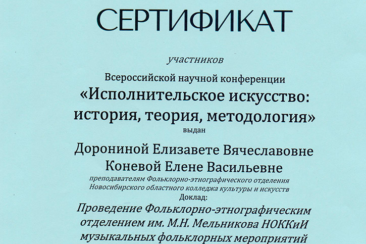 В Новосибирской государственной консерватории им. М.И.Глинки прошла научная конференция "ИСПОЛНИТЕЛЬСКОЕ ИСКУССТВО: ИСТОРИЯ, ТЕОРИЯ, МЕТОДОЛОГИЯ", в которой приняли участие преподаватели фольклорно-этнографического отделения им. М.Н.Мельникова.