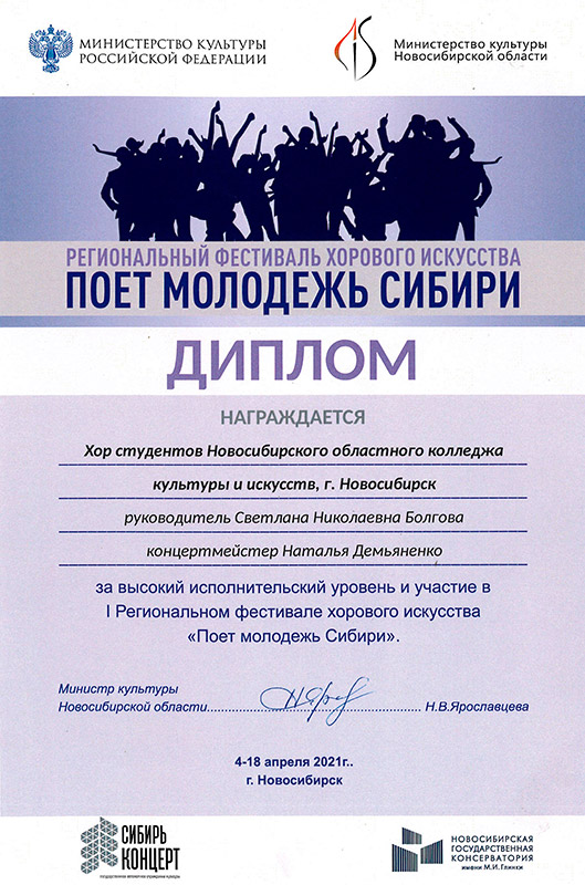 В Новосибирском музыкальном колледже имени А.Ф.Мурова в дистанционном формате состоялся первый региональный этап Всероссийского хорового фестиваля Новосибирской области "Поёт молодёжь Сибири", в котором приняли участие пять хоровых коллективов.