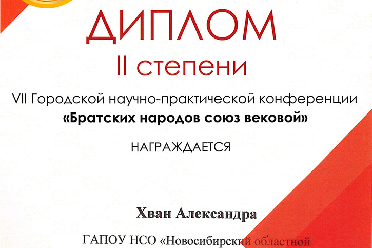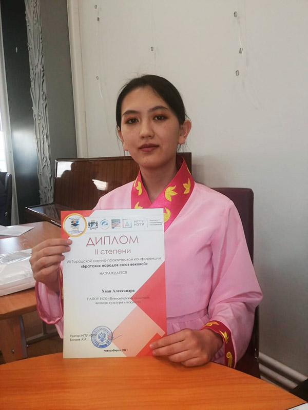 Студентка II курса отделения сольного и хорового народного пения Хван Александра получила диплом II степени за участие в Городской научно-практической конференции "Братских народов союз вековой".