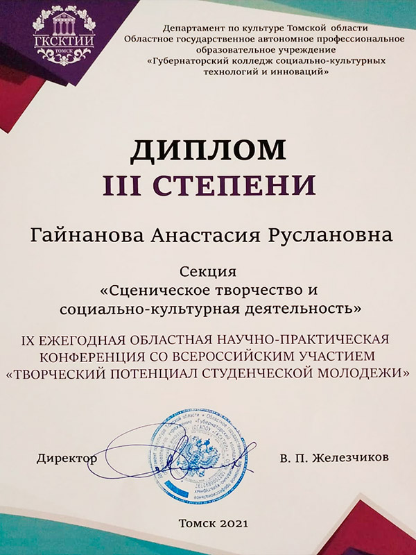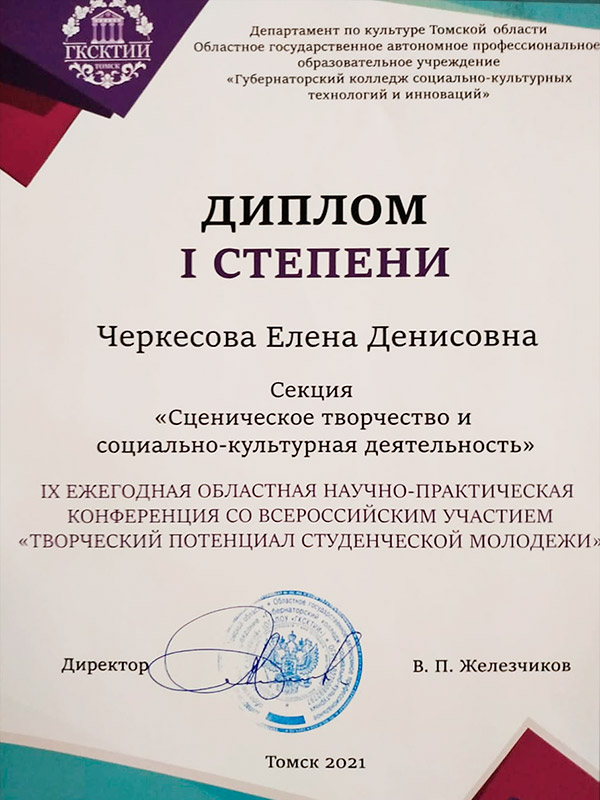 Студенки третьего курса режиссёрского отделения нашего колледжа Елена Черкесова и Анастасия Гайнанова получили дипломы в IX ежегодной областной научно-практической конференции со Всероссийским участием "Творческий потенциал студенческой молодёжи".