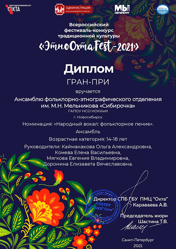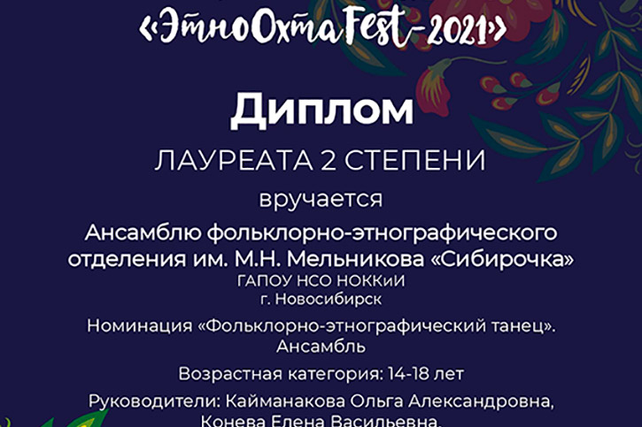 Ансамбль фольклорно-этнографического отделения им. М.Н.Мельникова "Сибирочка" нашего колледжа получил ГРАН-ПРИ в номинации "Народный вокал: фольклорное пение" и Диплом лауреата II степени в номинации "Фольклорно-этнографический танец".