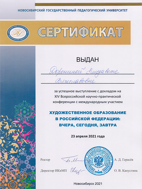 На базе Новосибирского Государственного Педагогического Университета прошла XIV Всероссийская научно-практическая конференция с международным участием "Художественное образование в Российской Федерации: вчера, сегодня, завтра". Организаторы конференции Институт культуры и молодежной политики, кафедра народной художественной культуры и музыкального образования.