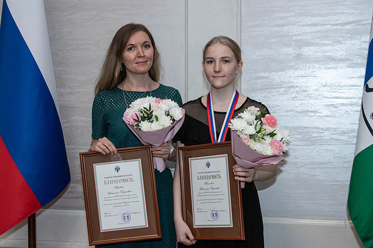 Чествование областной делегации прошло в большом зале Правительства региона. Татьяна Мелкова, получила Почётную грамоту от Андрея Травникова за "серебряную" медаль в номинации "Домра" и Стелла Першина, получившая специальный диплом игр в номинации "Эстрадное пение".