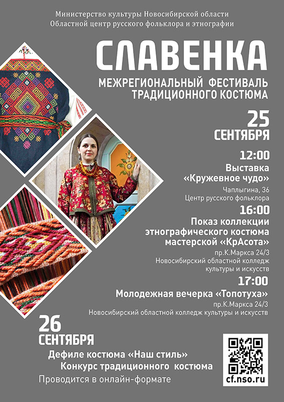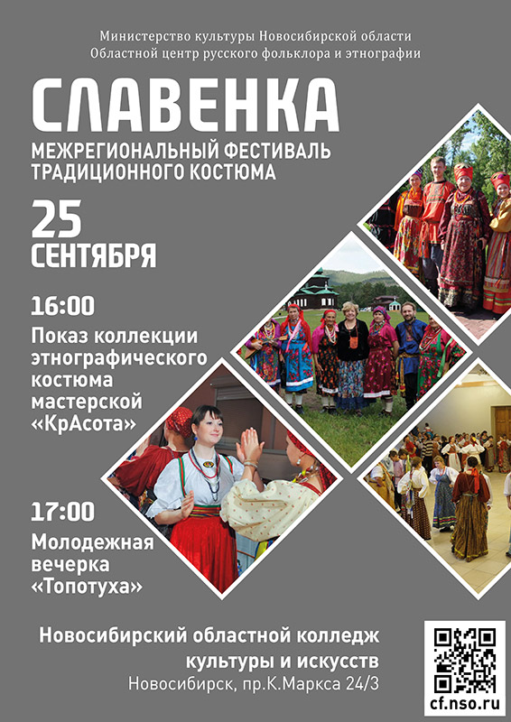 Областной центр русского фольклора и этнографии совместно с министерством культуры Новосибирской при поддержке Новосибирского областного колледжа культуры и искусств области уже в одиннадцатый раз организует фестиваль изготовителей народной одежды, мастеров декоративно-прикладного творчества и всех ценителей народной культуры. Фестиваль будет проходить 25 сентября в концертном зале нашего колледжа. 25 сентября в 16:00 - состоится показ коллекции этнографического костюма мастерской "КрАсота", а в 17:00 - начнётся молодёжная вечерника "Топотуха".