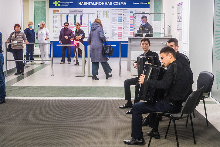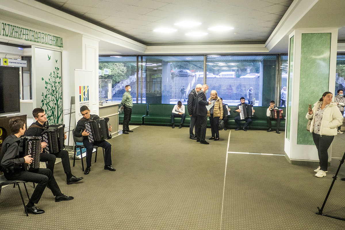 Ранним утром докторов и пациентов Новосибирской областной клинической больницы "Музыкой для здоровья" встречали наши артисты отделения русских народных инструментов. Студенты исполнили классические и популярные композиции на аккордеоне, баяне и гармони.