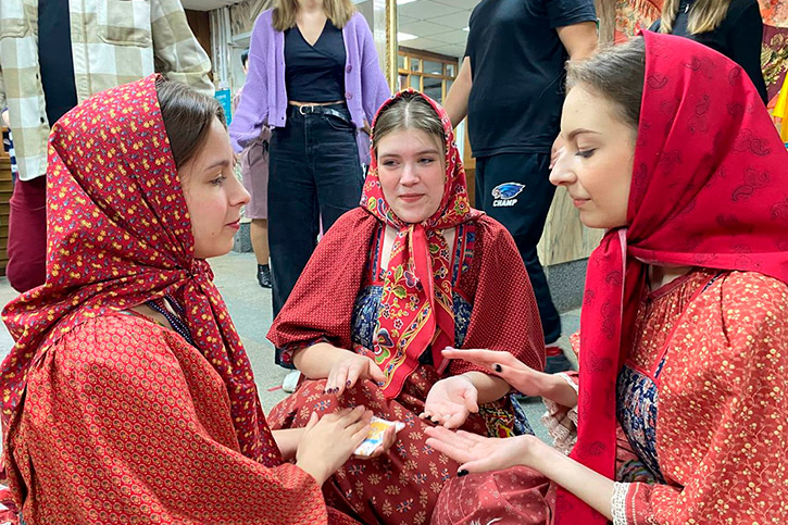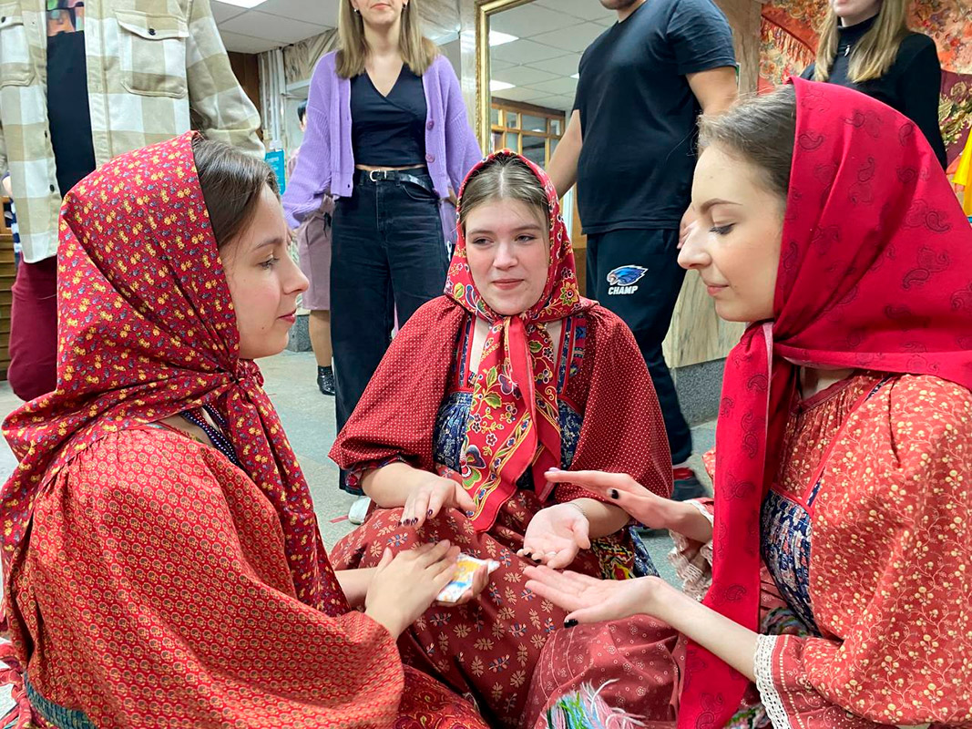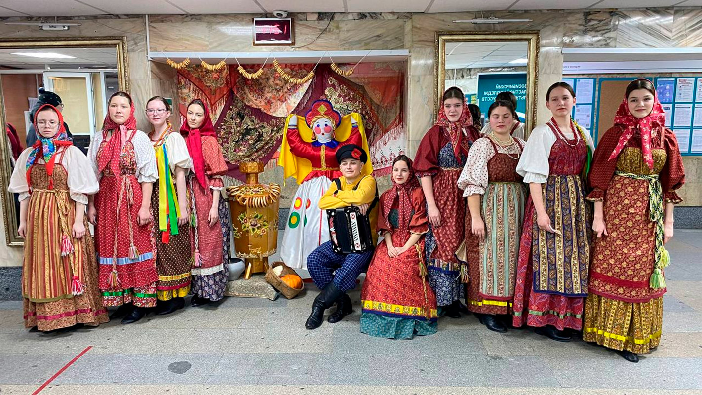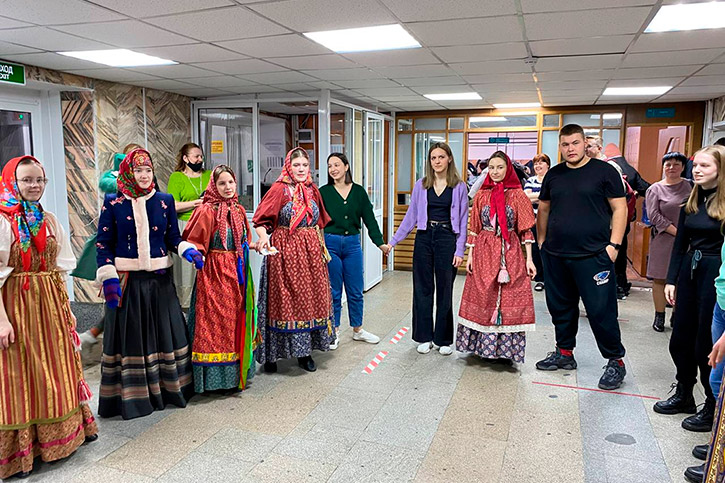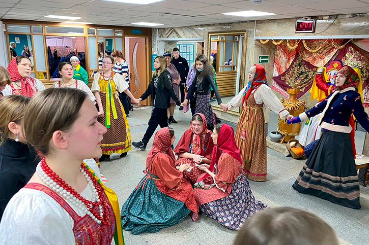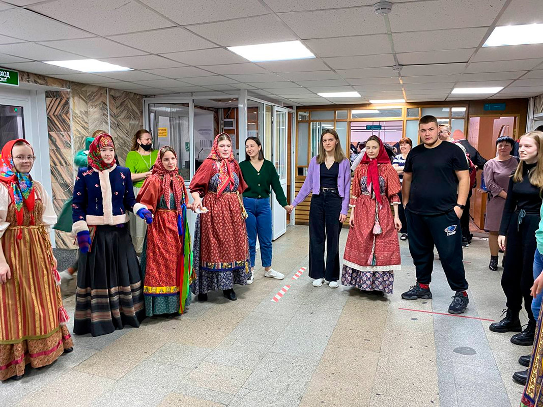 На большой перемене студенты фольклорно-этнографической секции отделения народно-певческого искусства водили хороводы, играли в традиционные игры, и конечно, пели масленичные обрядовые песни!