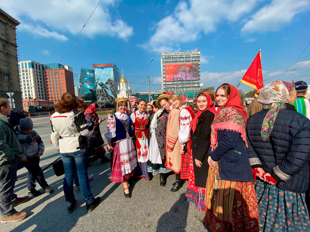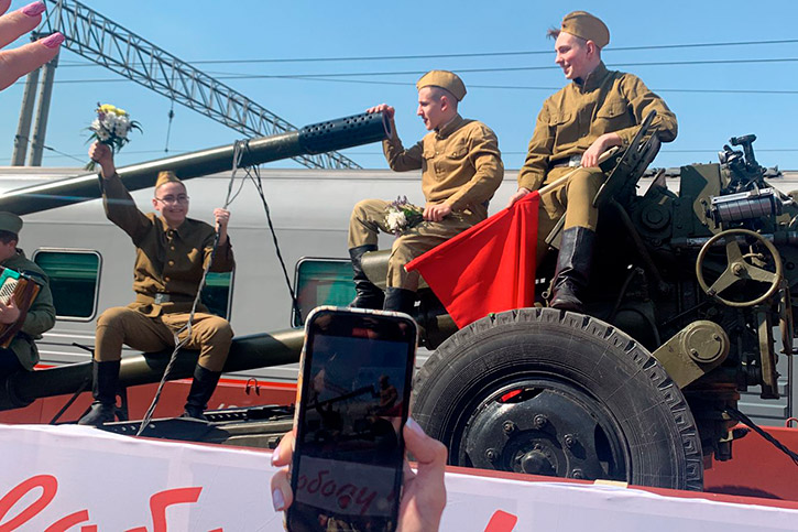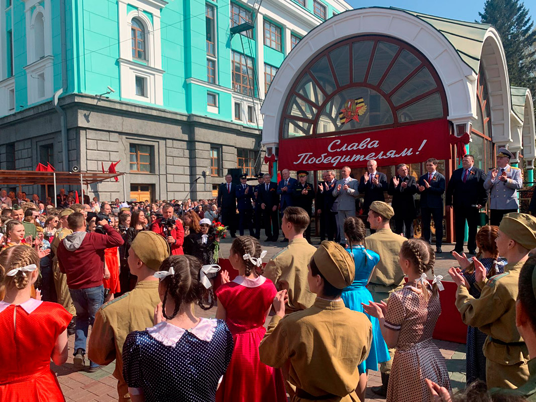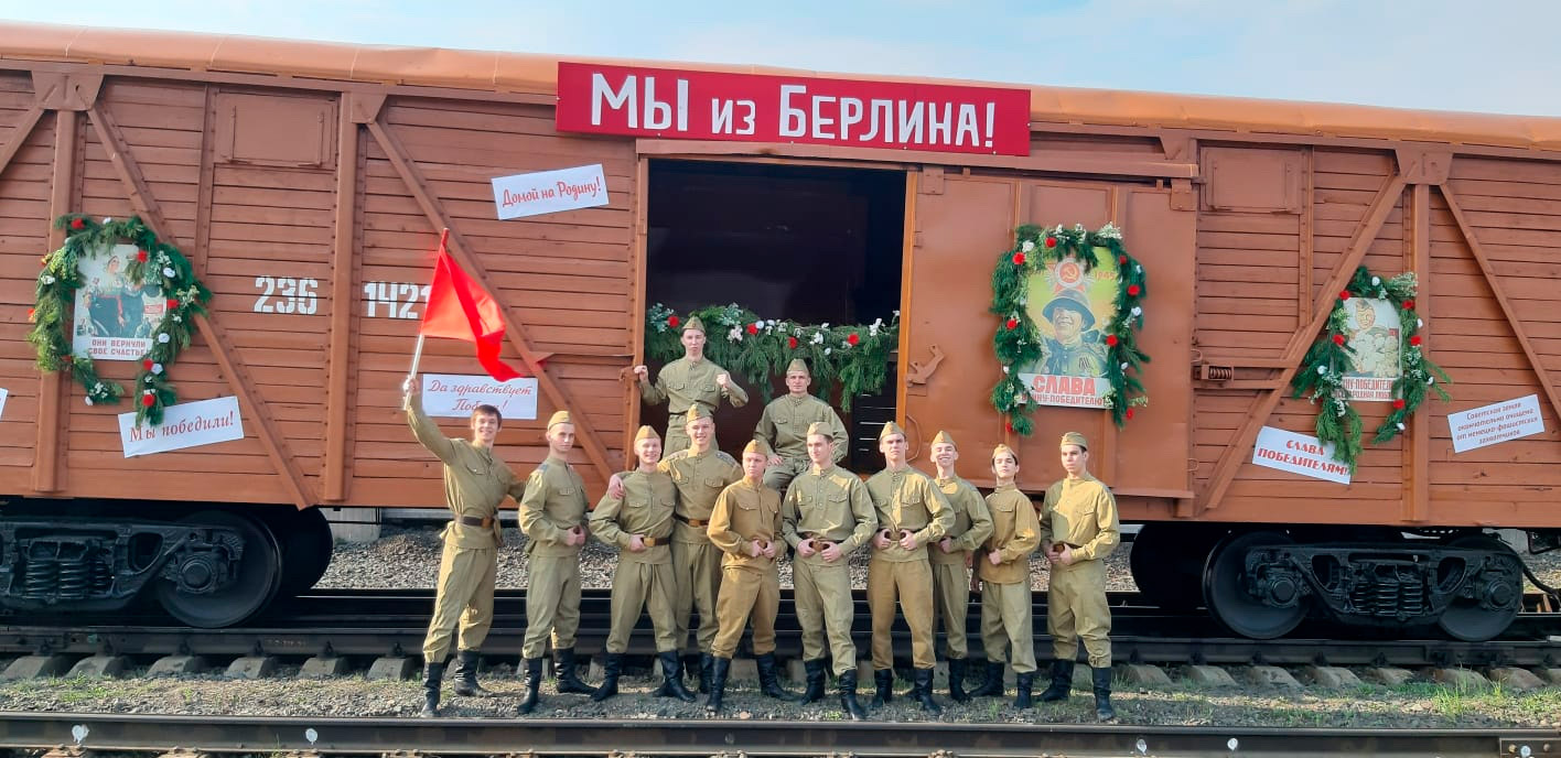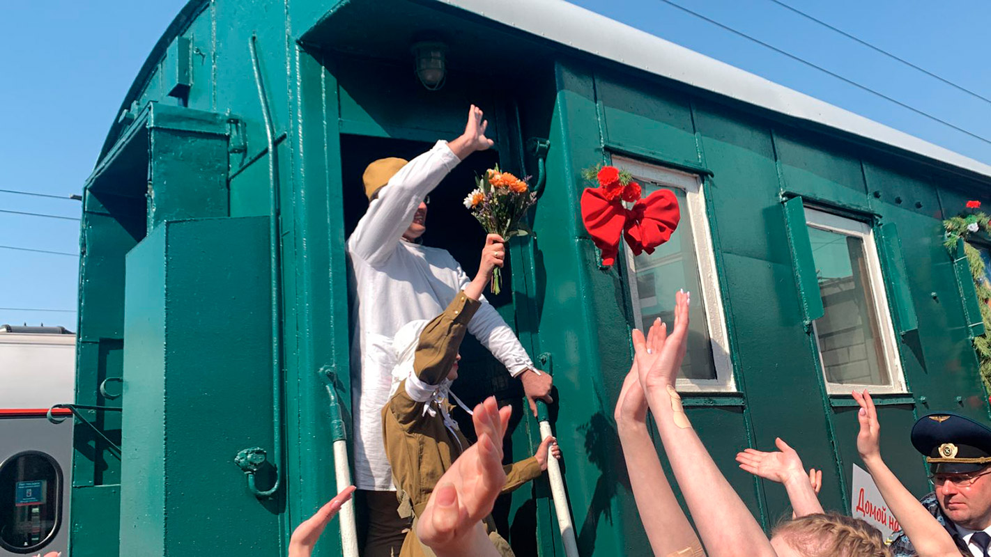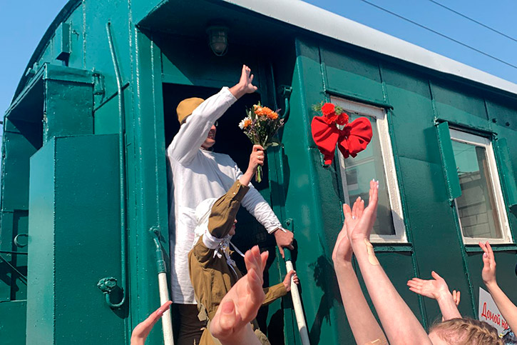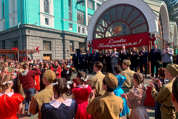 Так утром 6 мая на вокзале Новосибирск-Главный встречали ретро-поезд "Эшелон Победы". Новосибирцы увидели красочное театрализованное представление. Учащиеся и преподаватели колледжа предстали в образах воинов-победителей, вернувшихся с фронта.