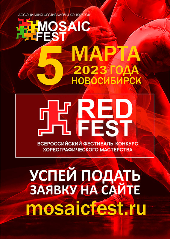 Также идет заявочная компания Всероссийского фестиваля конкурса хореографического мастерства "RED FEST", который состоится в Новосибирске 5 марта 2023 года. Фестиваль-конкурс проводится по двум формам (очная и/или дистанционная) на выбор участников в возрасте от 3 лет и старше (без максимального ограничения по возрасту) из разных регионов России по номинациям: хореография (все направления), хореографический спектакль, танец в фотообъективе (фотоискусство) (тема - танцевальное искусство), киноискусство (тема - танцевальное искусство), декоративно-прикладное и изобразительное искусство (тема - танцевальное искусство). В рамках RED FEST пройдет кастинг артистов для участия в Новосибирском детском театре мюзикла.