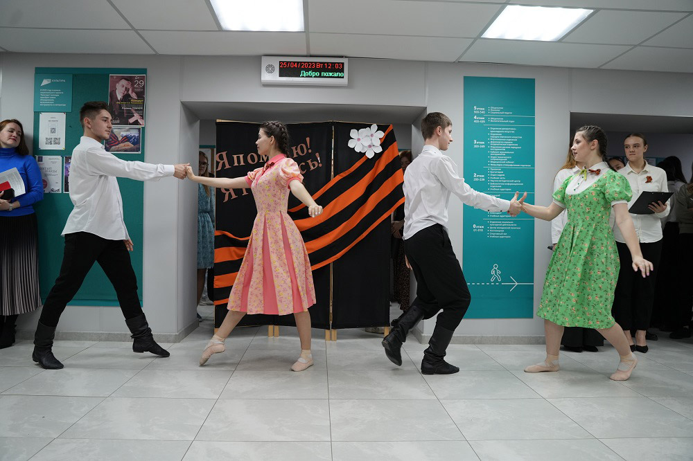 Традиционная акция "Георгиевская ленточка" собрала студентов и преподавателей на первом этаже колледжа. Участникам напомнили о сути ежегодной акции, ее правилах и традиционных ценностях.