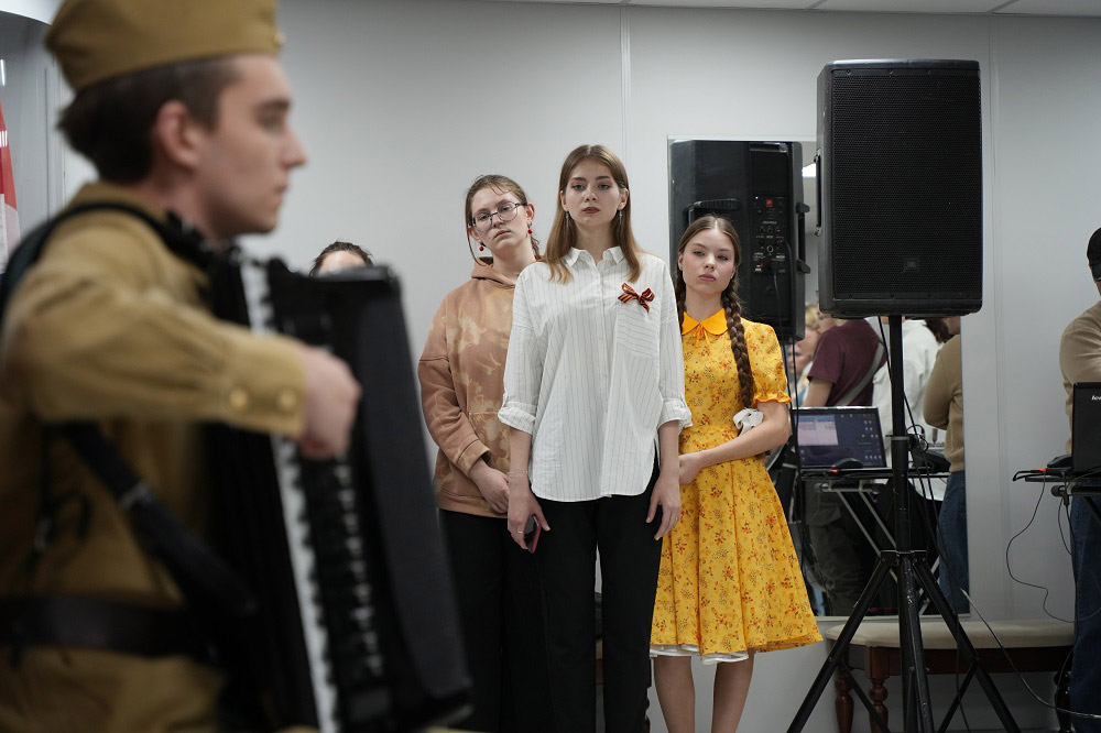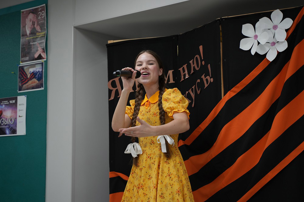 В исполнении наших артистов прозвучали песни и музыка военных и ближайших послевоенных лет. Затем волонтеры раздали участникам символ акции.