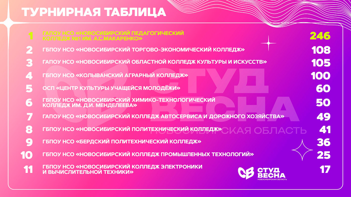 Всего в фестивале приняло участие 57 образовательных организаций города и области. Из 10 конкурсных направлений колледж был представлен в 4: танцевальное, театральное, вокальное и инструментальное.
