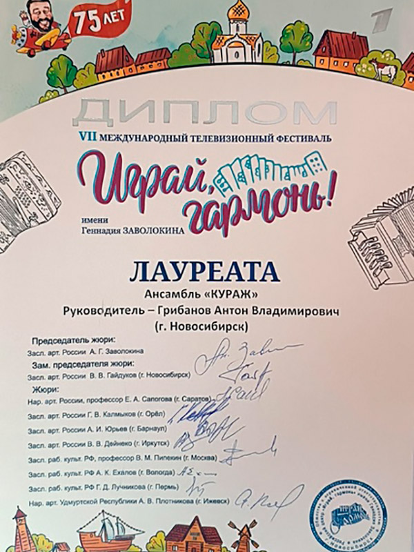 Помимо участия Антона Грибанова в мастер-классах, концерте ВИА "Кураж" в Бердске и участии в Вечере памяти Геннадия Заволокина, коллектив принял участие в записи телевизионной программы "Играй гармонь!", а также в главном концерте на большой сцене, где исполнил полюбившуюся многим песню "Вечер-вечерок" (музыка Антона Грибанова, слова Никона Сочихина).