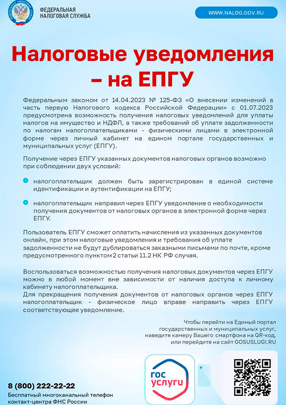 Федеральным законом от 14.04.2023 № 125-ФЗ "О внесении изменений в часть первую Налогового кодекса Российской Федерации с 01.07.2023 предусмотрена возможность получения налоговых уведомлений для уплаты налогов на имущество и НДФЛ, а также требований об уплате задолженности по налогам налогоплательщиками - физическими лицами в электронной форме на едином портале государственных и муниципальных услуг (ЕПГУ, кратко - Госуслуги).