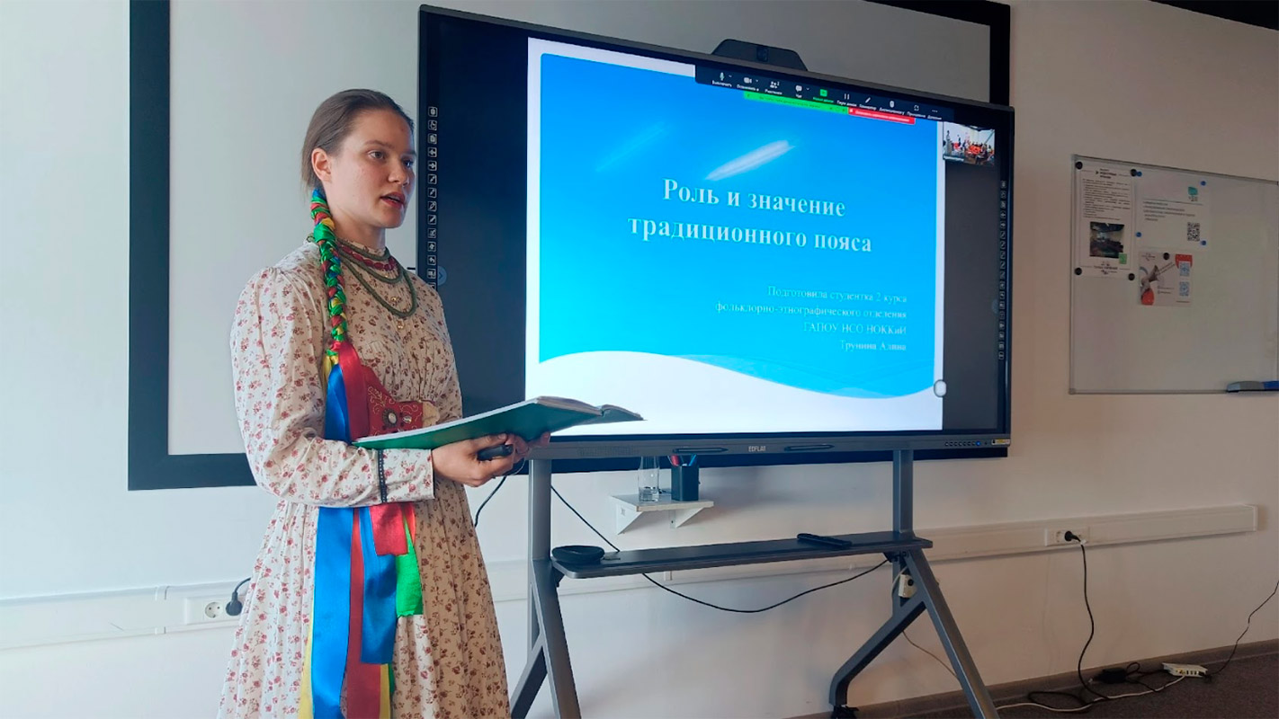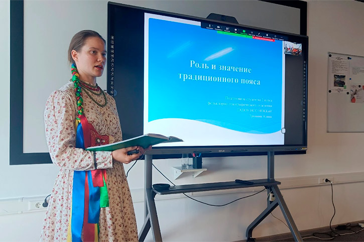 С докладами выступили: Виктория Брикман, 4 курс - "Святочный обряд в образовательном процессе", Алина Трегубова, 2 курс - "Роль и значение традиционного тканого пояса". Заведующая отделением Елена Конева также выступила с докладом - "Народное художественное творчество по виду: Этнохудожественное творчество - актуальные пути развития". Конференция проходила в "Точке кипения" в Академпарке.