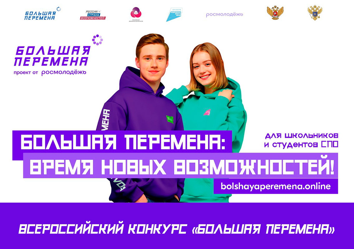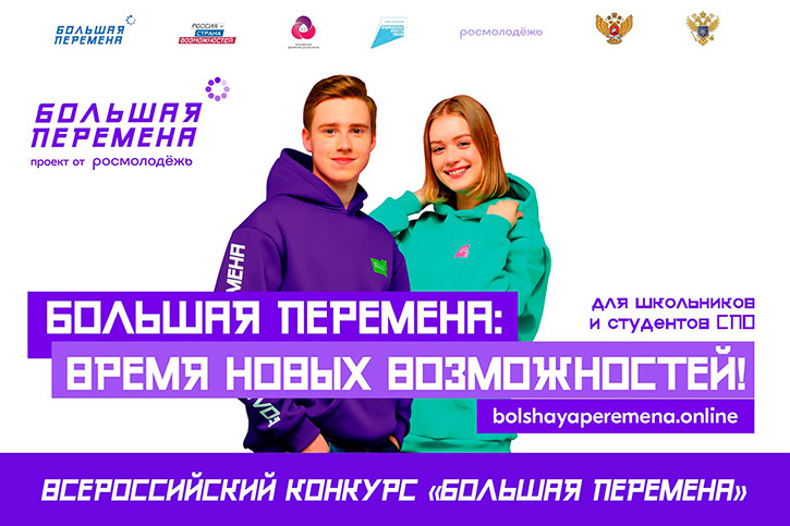 Всероссийский конкурс "Большая перемена" является флагманским проектом Российского движения детей и молодежи "Движение первых". Соорганизатором проекта выступает Федеральное агентство по делам молодежи (Росмолодежь). Конкурс входит в линейку президентской платформы "Россия - страна возможностей" и проводится при поддержке Министерства просвещения РФ.