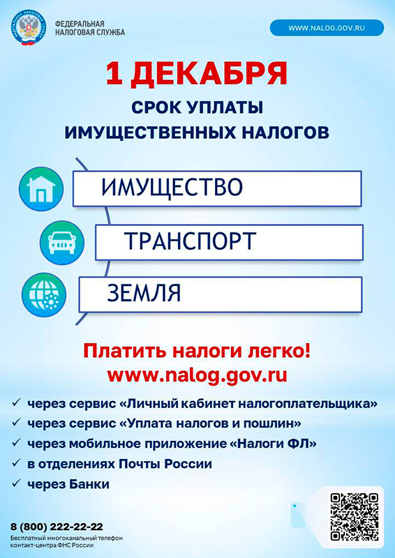 Уплатить имущественные налоги удобнее всего онлайн через портал госуслуг, а также через Личный кабинет налогоплательщика или сервис "Уплата налогов и пошлин" на сайте ФНС России, но можно это сделать через кассы или терминалы банков и офисы Почты России. Срок уплаты - не позднее 1 декабря.