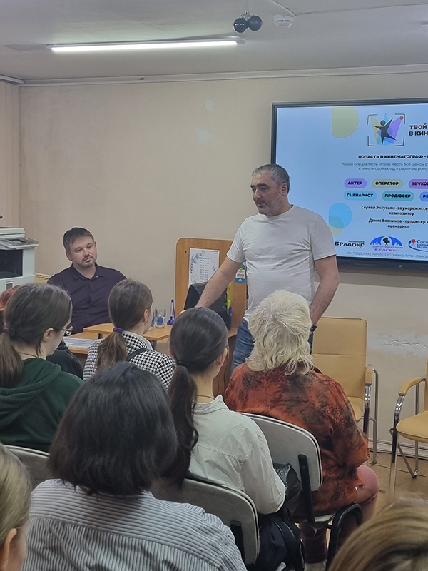 7 декабря в библиотеке колледжа у студентов, учащихся и педагогов Школы креативных индустрий, слушателей курсов переподготовки состоялась творческая встреча "Попасть в кинематограф - не сложно!" с руководителем Студии игрового кино "Краски", членом союза Кинематографистов РФ, сценаристом и продюсером Денисом Вязниковым, звукорежиссером кино, композитором, владельцем профессиональной студии звукозаписи IVA Records Сергеем Эксузьяном и Никитой Михайловым, сценаристом, режиссером, представляющим творческое объединение "БИЗАР". Многие знают его как режиссера фильма для незрячих и слабовидящих "Апостол", премьера которого состоялась в кинотеатре "Победа" в июле этого года.