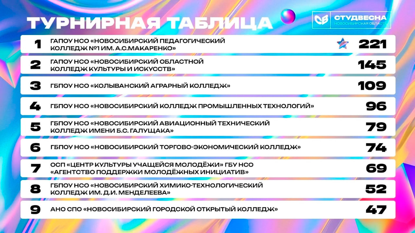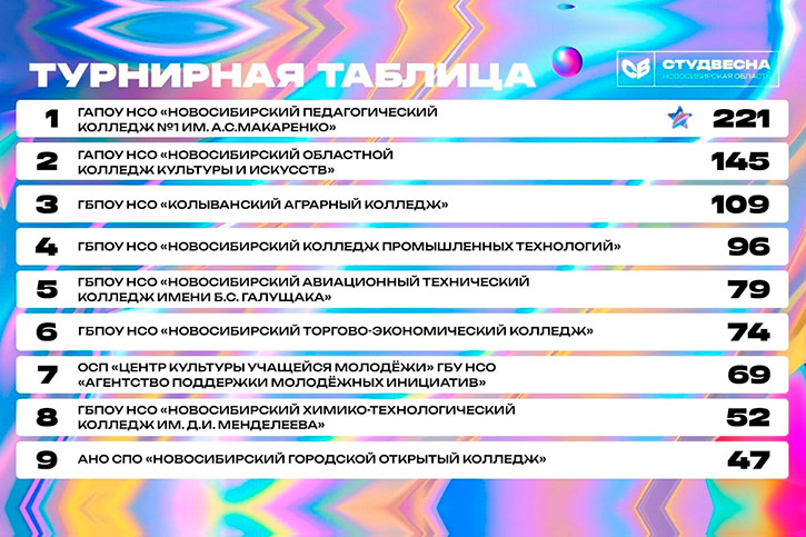 Всего в этом году фестиваль собрал 800 участников, включая заявки от ВУЗов и организаций системы профессионального образования. По итогам командного зачета, Новосибирский областной колледж культуры и искусств уверенно занял второе место, среди участвовавших профессиональных образовательных организаций.