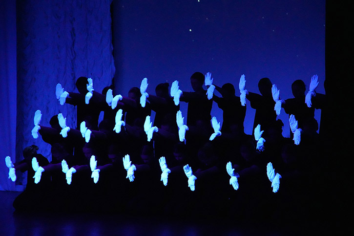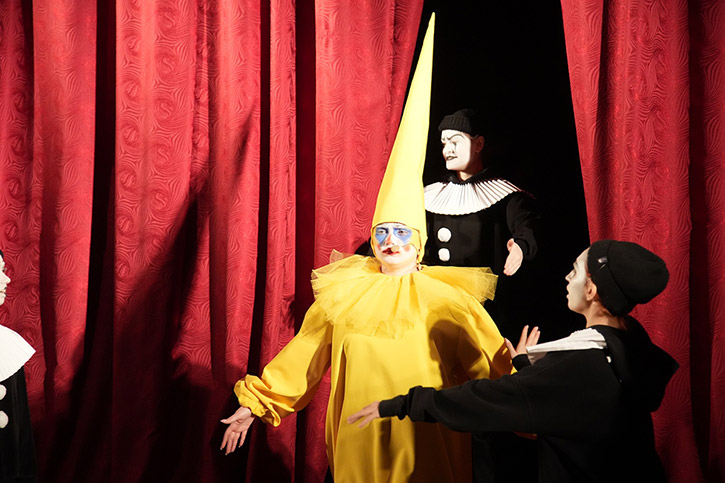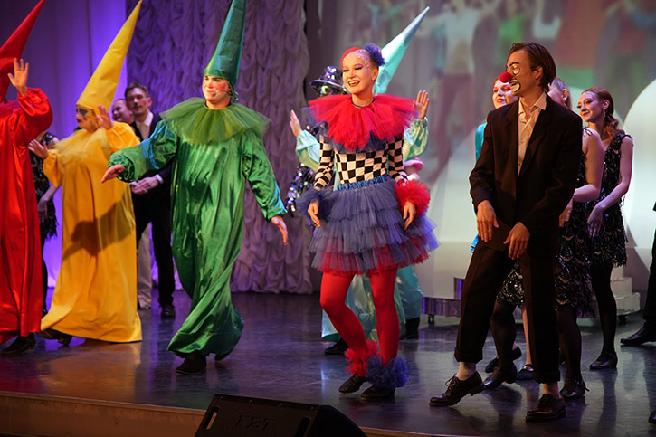 Юные артисты - студенты колледжа разыграли для собравшихся красочное представление. На сцене бушевал шумный карнавал, танцевал Арлекин, выступали клоуны. Звучали музыкальные композиции. Большое впечатление оставила у зрителей сцена, посвященная памяти преподавателей и сотрудников отделения.