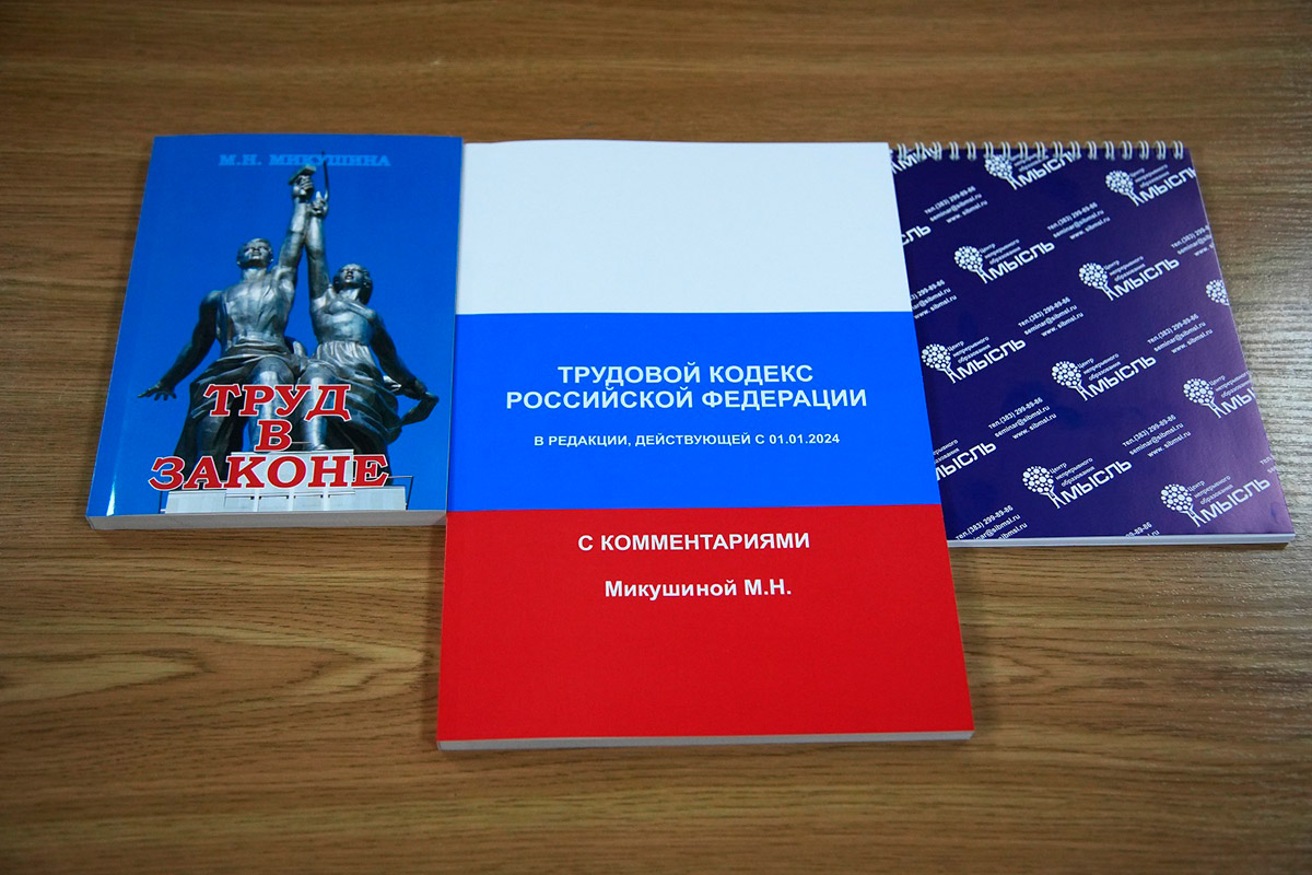 Слушатели курса, перед занятием, получили методическую и образовательную литературу, в том числе книгу Марины Микушиной "Труд в законе" (путеводитель по трудовому законодательству и кадровому делопроизводству).