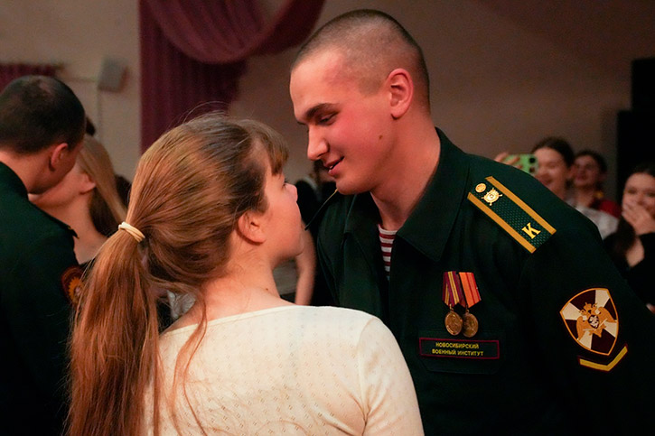 В гости на вечерку приехали курсанты Новосибирского военного ордена Жукова института им. генерала армии Яковлева, войск национальной гвардии Российской Федерации. Они приняли самое активное участие в масленичных забавах.