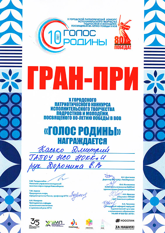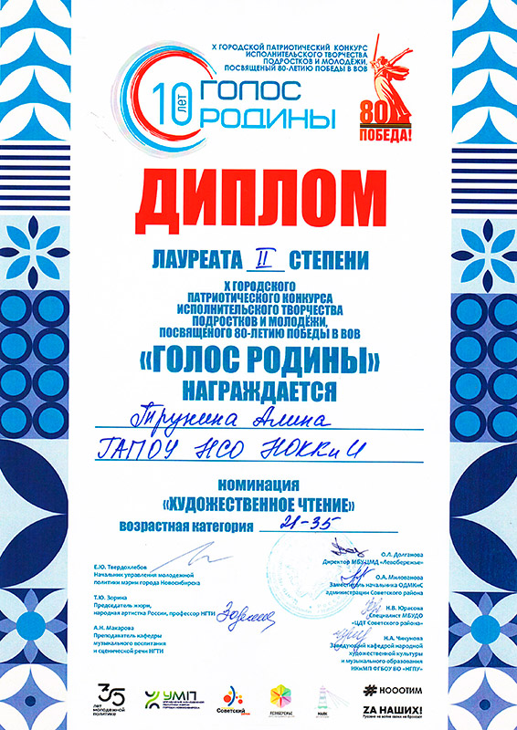 Студенты фольклорно-этнографического отделения приняли участие в X городском патриотическом конкурсе исполнительского творчества подростков и молодежи "Голос Родины". В этом году творческое состязание посвятили 80-летию Победы в Великой Отечественной войне.
