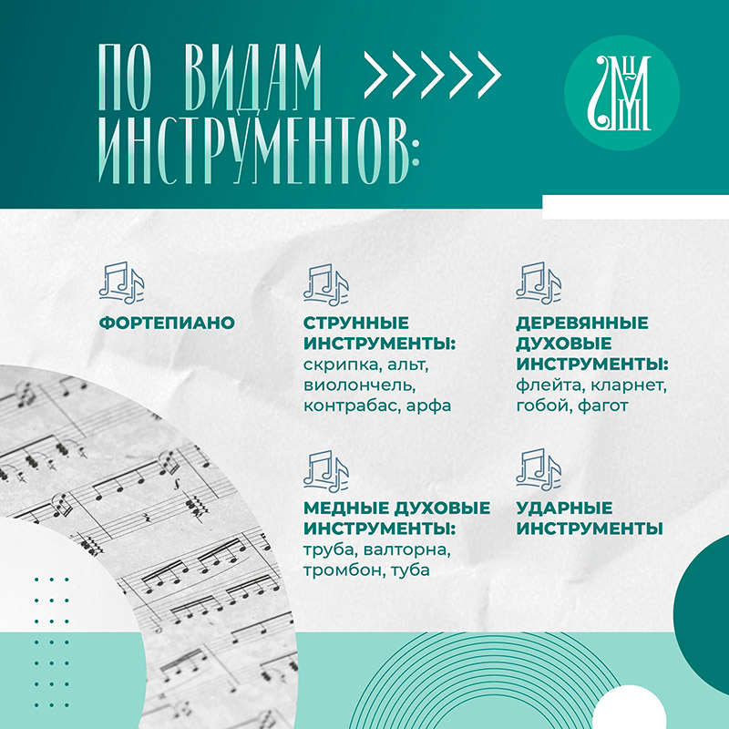 - струнные инструменты: скрипка, альт, виолончель, контрабас, арфа