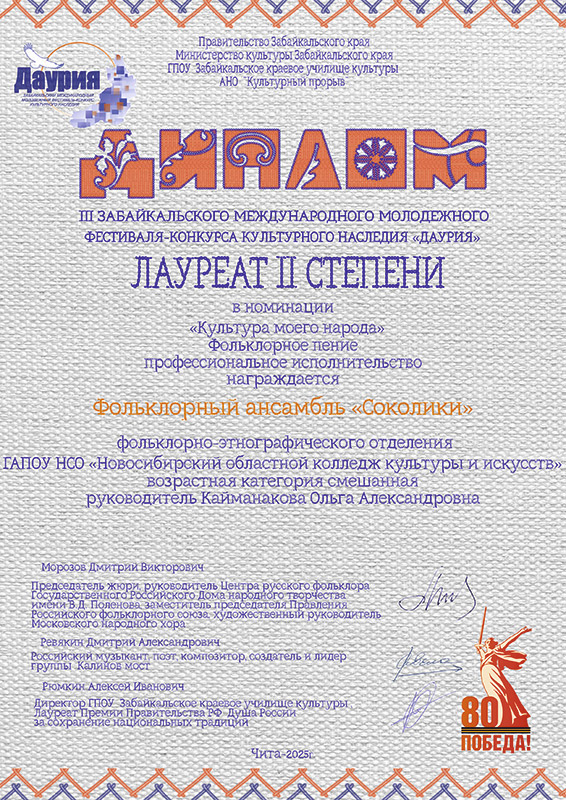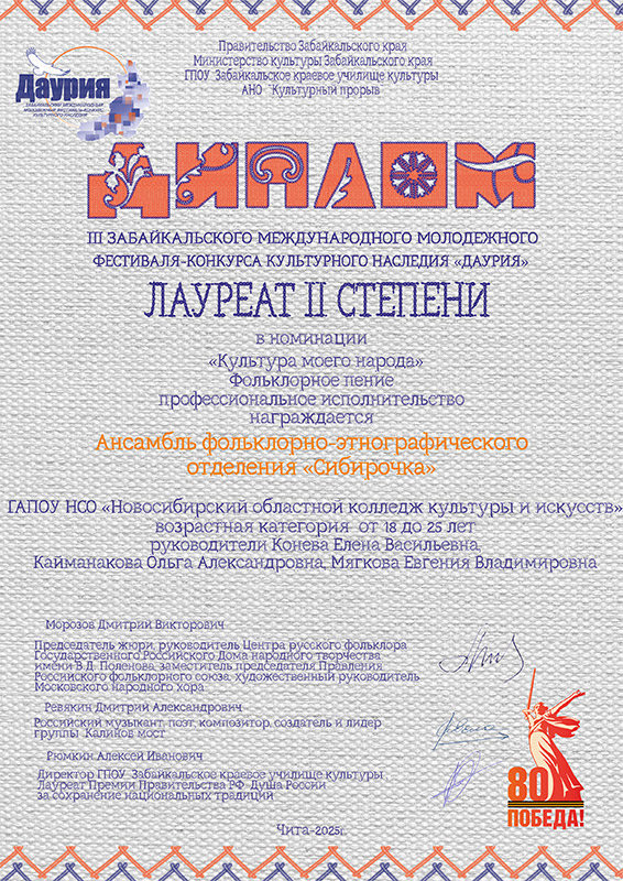 Ансамбли "Сибирочка" и "Соколики" фольклорно-этнографического отделения стали лауреатами 2 степени на III Забайкальском международном молодёжном фестивале-конкурсе культурного наследия "Даурия". Конкурс проходил дистанционно, и сейчас наших лауреатов ждут в гости в мае на сам фестиваль.