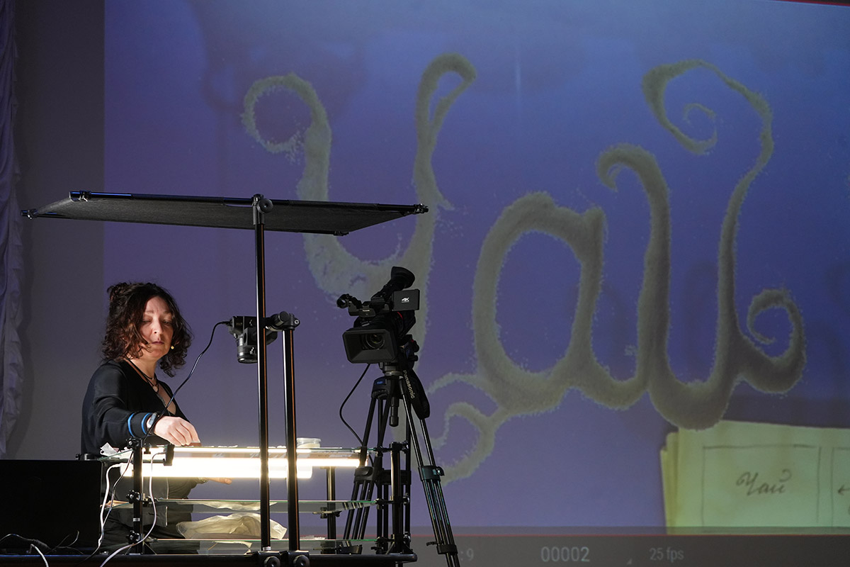 А художник-мультипликатор Наталья Соколова поэтапно продемонстрировала как с помощью сыпучих продуктов, например, из риса или манной крупы, снять анимационную историю.