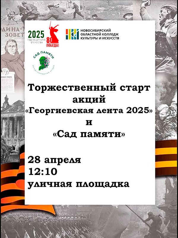 НОККиИ приглашает присоединиться к Всероссийской акции "Георгиевская лента", которая стартует 28 апреля в каждом регионе страны. Это эстафета от прошлых поколений к нынешним, чтобы каждый из нас мог сказать себе: "Я помню! Я горжусь!". Традиционная акция "Георгиевская лента" проводится в колледже уже более пяти лет. Сейчас студенты и педагоги помогают в подготовке мероприятий в штабе "Волонтёров Победы" и, конечно же, в родном колледже. Кроме того, в год юбилея Великой Победы НОККиИ присоединяется к Международной акции "Сад памяти": на территории колледжа 28 апреля посадят Аллею памяти. Ждём всех 28 апреля в 12.10!