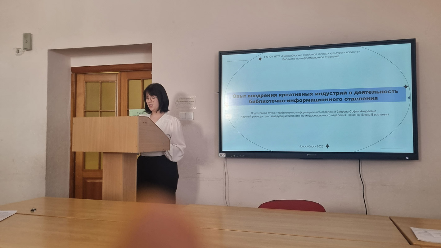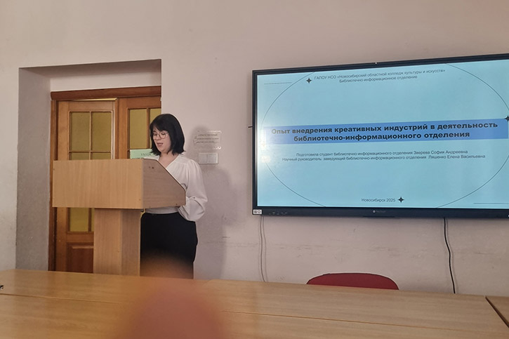 Студентка 3 курса Зверева София (научный руководитель Е.В.Ляшенко) рассказала о взаимодействии отделения со Школой креативных индустрий и внедрении креативных технологий в библиотечные проекты.