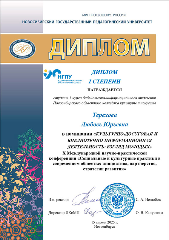 Студенты выступили на высоком уровне. Они продемонстрировали профессиональные навыки и компетенции, которыми сегодня должен обладать каждый современный библиотекарь. И, вот, итоги подвели! Высянилось, что работы наших студентов были удостоены ДИПЛОМОВ 1 СТЕПЕНИ.