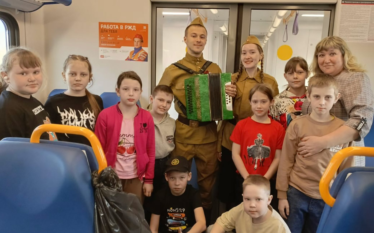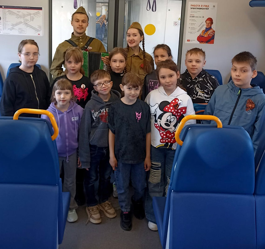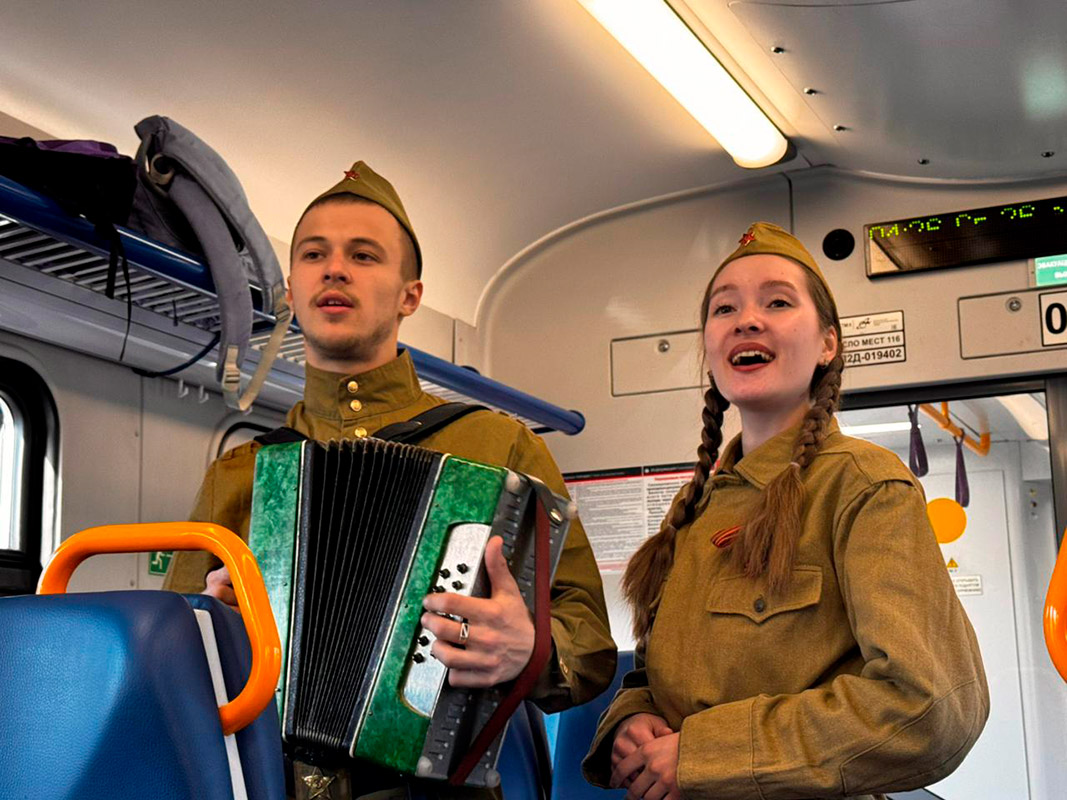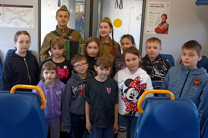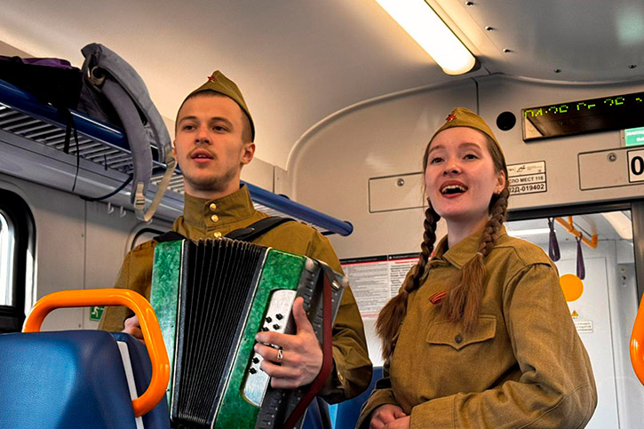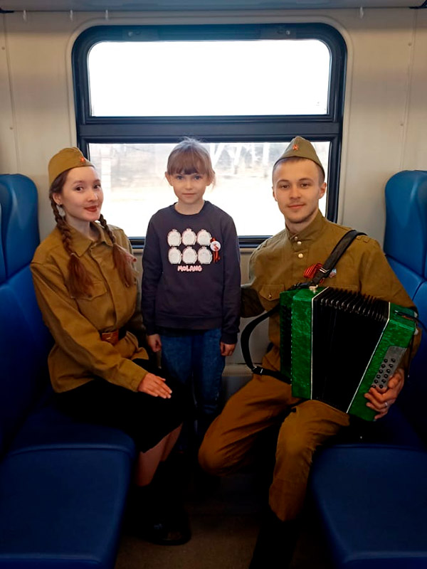 В вагонах студенты исполняли фольклорные песни: "Солнце закатилось", "Прощался парень" и др. И, конечно же, все вместе под аккомпанемент гармони пели известные и любимые "Катюшу", "Смуглянку", "День Победы. Как рассказали студенты, общение со школьниками получилось очень тёплым и живым. Дети подхватили творческую эстафету и уже сами читали стихи о Победе. Из поезда на вокзал тоже шли с песнями.