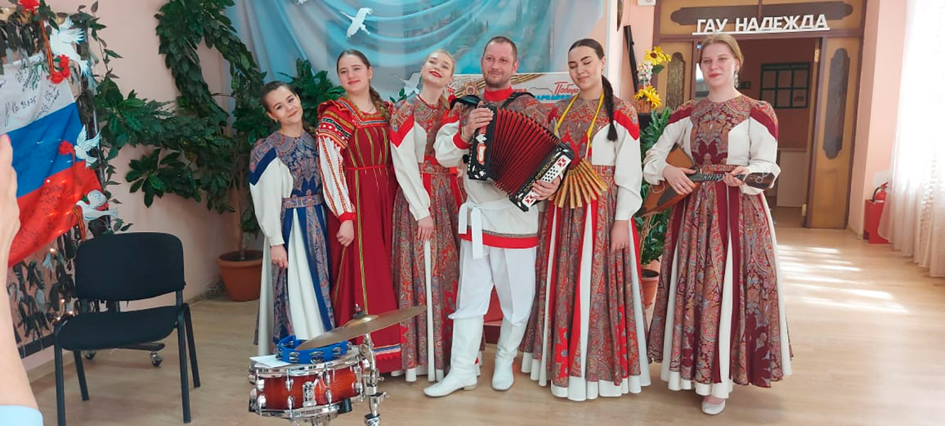 Накануне Дня Победы вокально-инструментальный ансамбль колледжа культуры пригласили с концертной программой "Душой с Россией" в комплексный областной центр социальной реабилитации "Надежда". Там сейчас проходят восстановление бойцы специальной военной операции. "Кураж" исполнил народные и авторские песни, в том числе, песни руководителя ансамбля Антона Владимировича Грибанова. В финале концерта организаторы встречи поблагодарили "Кураж" и колледж культуры за создание душевной и праздничной атмосферы. И просили передать директору НОККиИ Аркадию Борисовичу Козиорову благодарственное письмо.