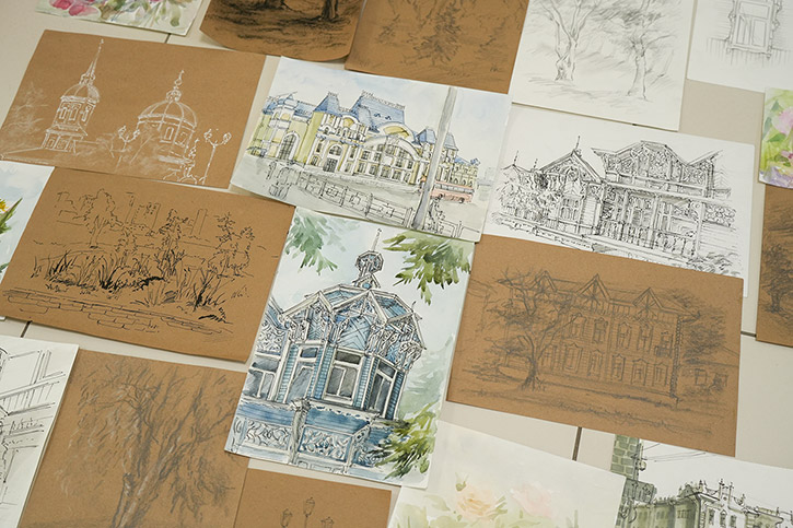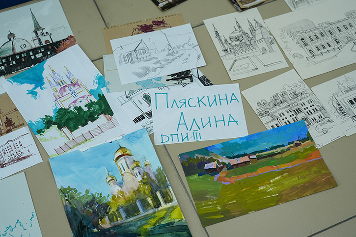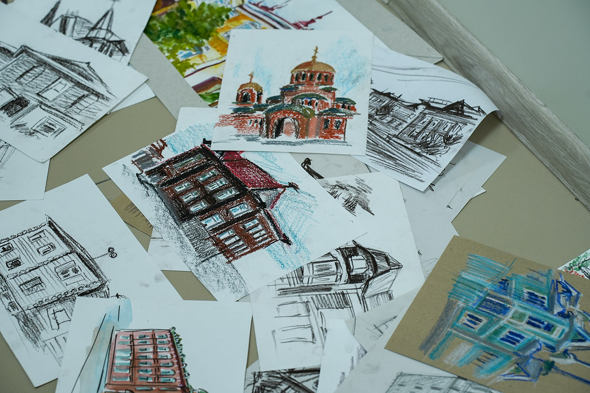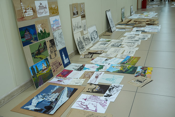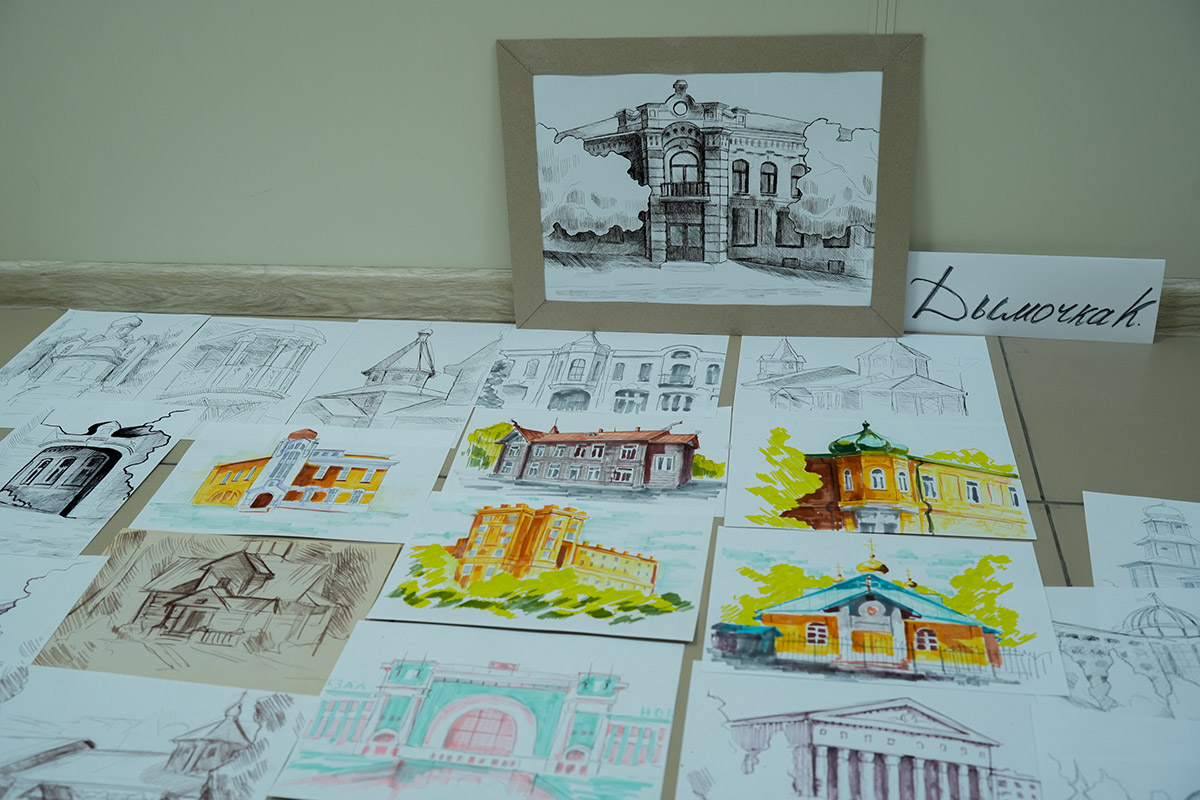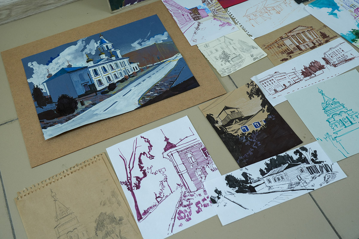 Напомним, в старинном сибирском городе студенты были на пленэре. Первый и второй курс - рисовали с натуры, у третьекурсников была практика по изучению памятников искусства. Каждый должен был делать наброски - это быстрый рисунок без детализации, передающий образ, характер. На него уходит, примерно, 15 минут. Зарисовка занимает дольше времени. Здесь рисунок уже более академический. По зарисовкам и наброскам дома студенты уже заканчивали итоговую работу.