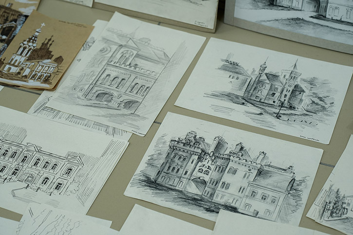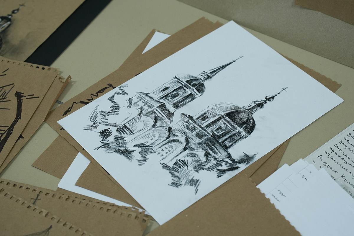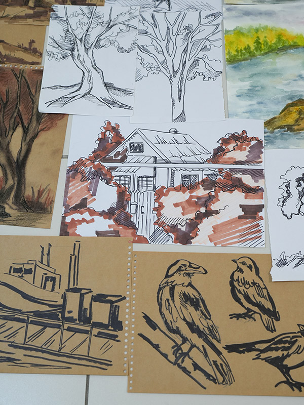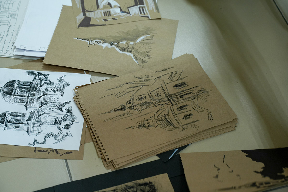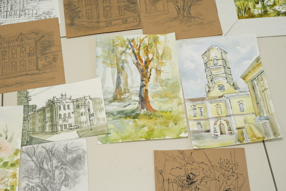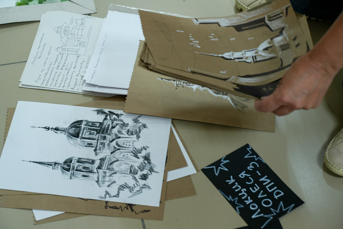 Напомним, в старинном сибирском городе студенты были на пленэре. Первый и второй курс - рисовали с натуры, у третьекурсников была практика по изучению памятников искусства. Каждый должен был делать наброски - это быстрый рисунок без детализации, передающий образ, характер. На него уходит, примерно, 15 минут. Зарисовка занимает дольше времени. Здесь рисунок уже более академический. По зарисовкам и наброскам дома студенты уже заканчивали итоговую работу.