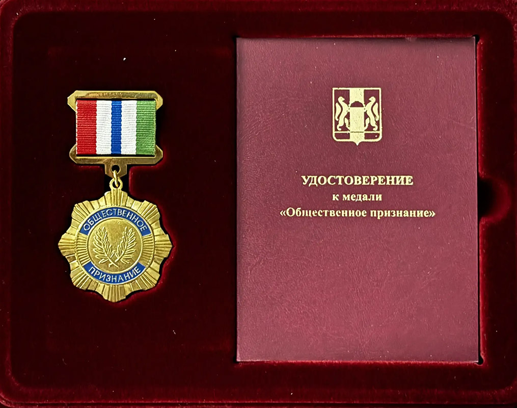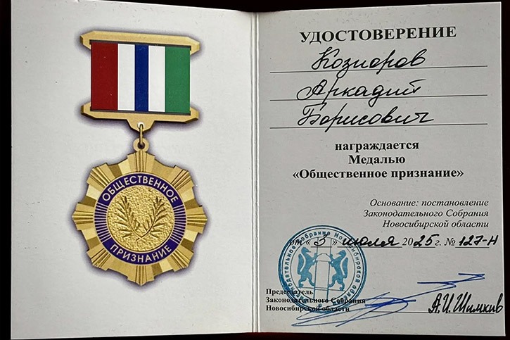Медаль "Общественное признание" Законодательного Собрания Новосибирской области подчёркивает вклад Аркадия Борисовича Козиорова в развитие культуры и образования, а также признание его заслуг перед обществом.