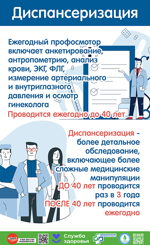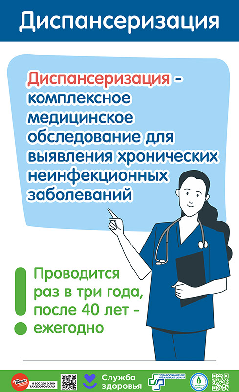 Диспансеризация - комплекс мероприятий, включающий медицинский осмотр врачами нескольких специальностей, применение необходимых методов обследования, формирование групп состояния здоровья, проведение профилактического консультирования, лечебно-оздоровительных мероприятий и динамического наблюдения за состоянием здоровья выявленных больных. Все обследования направлены на раннее выявление хронических неинфекционных заболеваний, являющихся основной причиной инвалидности и преждевременной смертности населения, а также основных факторов риска их развития, выявление вредных привычек.
