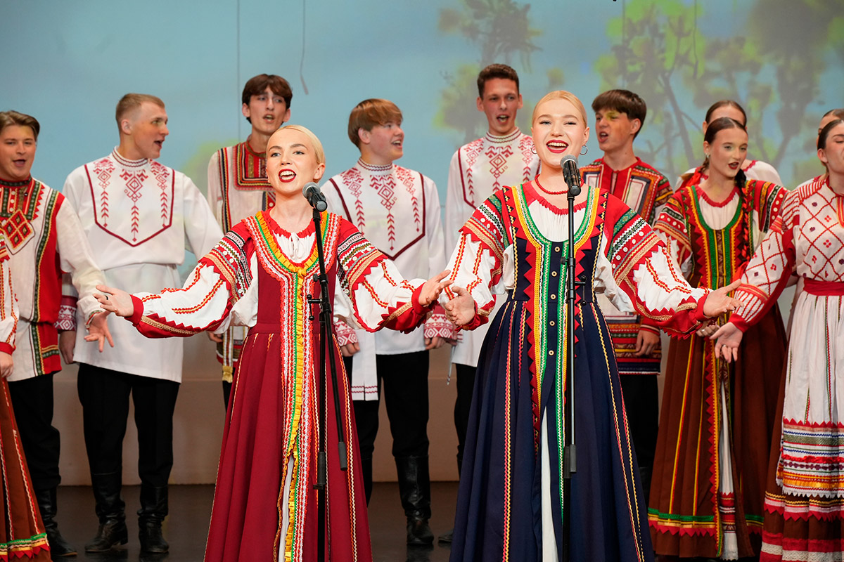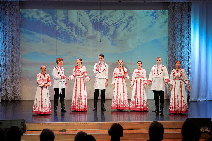 И для всех гостей праздника в подарок красивая и душевная программа от студентов и преподавателей колледжа. На сцене выступали: Екатерина Корабельникова, Ульяна Фролова, Анастасия Шмидт, ансамбль народной песни "Первоцвет", квартет гитаристов, камерный балет и русский народный хор НОККиИ.